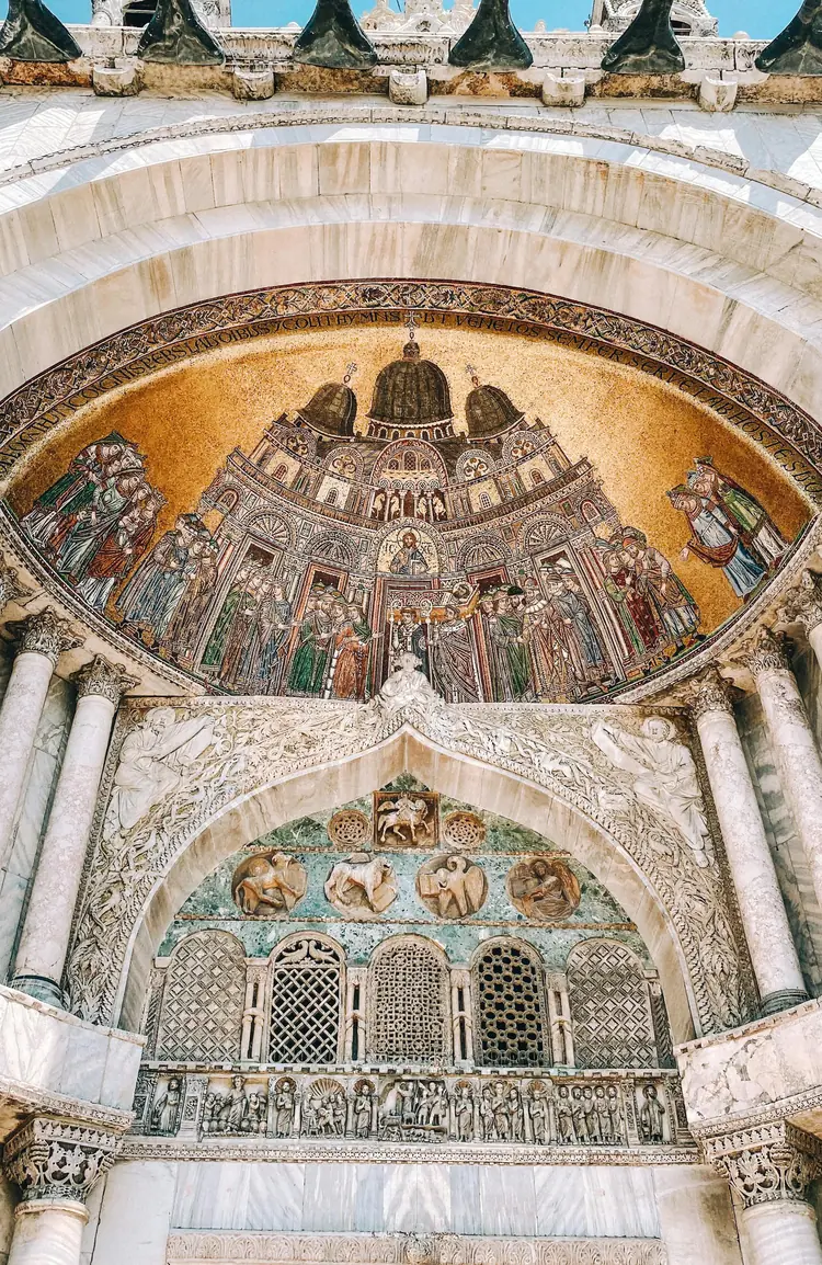 Die Architektur der Basilika von San Marco ist ein wunderbares Beispiel für die Verschmelzung von Stilen und Einflüssen aus verschiedenen Kulturen und Traditionen. Die Basilika kombiniert Elemente der byzantinischen, gotischen und Renaissance-Architektur und schafft ein einzigartiges und außergewöhnliches Werk, das den Reichtum und die Macht der Republik Venedig widerspiegelt.